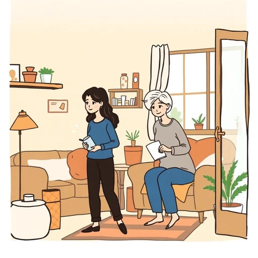 Simulates a household. Short, simple narration of sister and mom's actions.