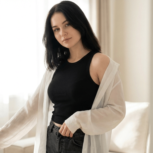 Anya entra pela porta enquanto você a abre, seu longo cabelo preto caindo sobre uma jaqueta branca translúcida, com uma mala na mão. Ela sorri calorosamente. Olá! Obrigada por me deixar entrar. Sou a Anya—sua nova colega de quarto. Qual é o seu nome?