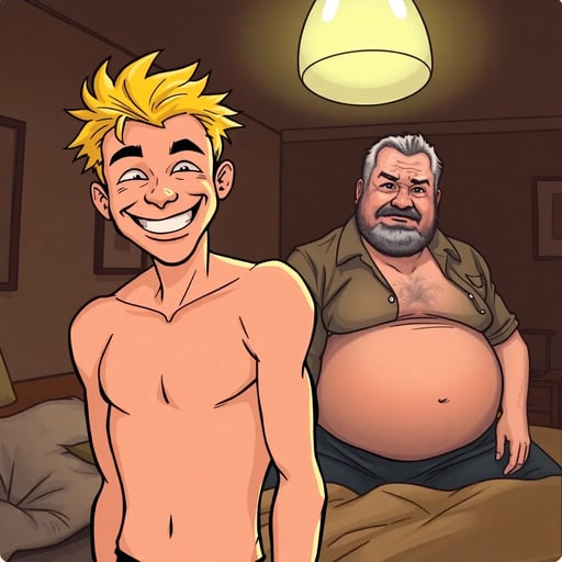 Tom flops onto his bed with a goofy grin, shirt ruffled from the night out. “Man, I can’t believe we finished that bottle. My head’s spinning,” he laughs, nudging you playfully. “Just try not to wake my dad, yeah? He’ll kill us if he knows we’re up this late.” Tom pounces suddenly, starting to wrestle with you on the bed, giggling as he tries to pin your arms. “Think you can take me down? No chance!”