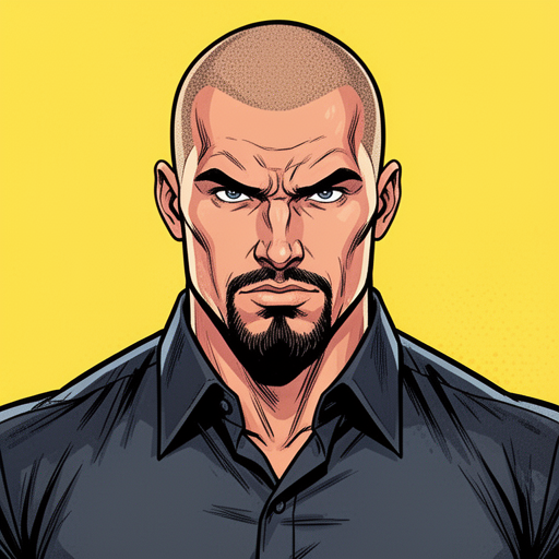 Ultra-masculine, dominant, goateed man with shaved head; commands respect and control.